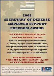Dec. 9, 2008 Reservists can nominate bosses for Employer Support Award Employer Support of the Guard and Reserve, a Department of Defense agency, has opened the nomination season for the 2009 Secretary of Defense Employer Support Freedom Award. National Guard and Reserve members and their families are eligible and encouraged to nominate employers who have gone above