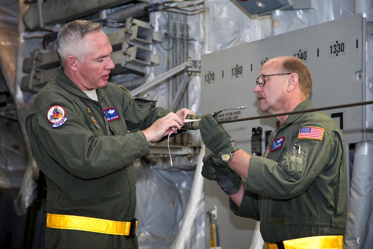 Tech. Sgt. Mark R. Corrigan, a loadmaster assigned to the 317th Airlift Squadron at Joint Base Charleston, S.C., monitors cargo exiting a C-17 Globemaster III aircraft during a recent training mission over North Auxiliary Airfield, North, S.C. Aircrews from the 437th and 315th Airlift Wings at Joint Base Charleston conducted a large formation exercise (LFE) consisting of 13 C-17 Globemaster III aircraft Wednesday, April 9, 2013. The mission included a variety of training exercises consisting of airdrops, aerial refueling and low level tactical training. These skills are needed at all times to ensure mission readiness, locally and globally. (U.S. Air Force photo/Senior Airman Bobby Pilch)