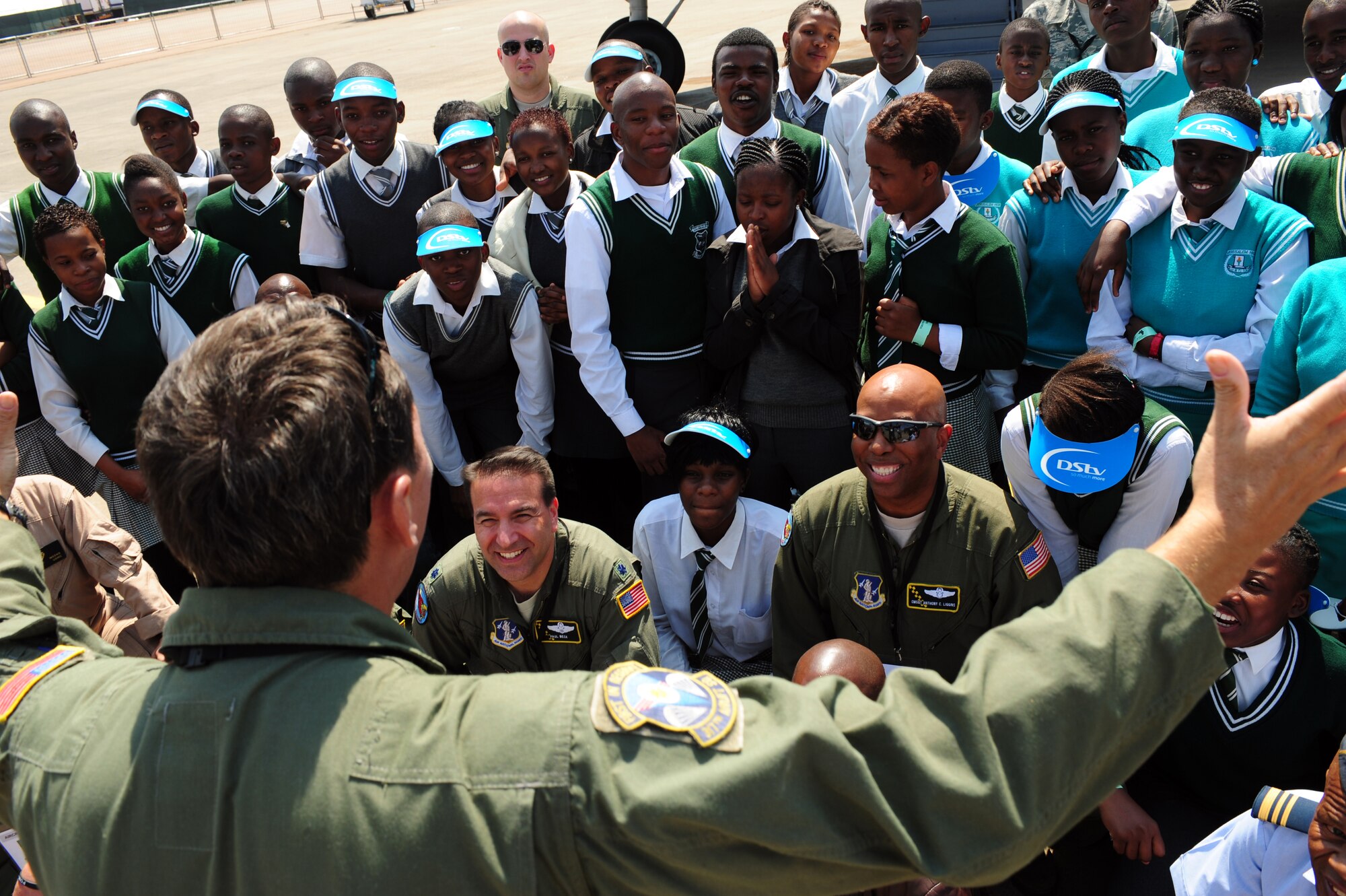 Staff Sgt. Justin Palmer with a youth group from Mozambique during the 2012 Africa Aerospace and Defense Exposition at Waterkloof Air Force Base, South Africa, Sept. 22-23. Palmer helped escort more than 300 youth during the event. More than 100,000 visitors attended the event which filled seven hangars with displays and included more than 90 aircraft, land vehicles and watercraft. Palmer is a loadmaster with the 300th Airlift Squadron at Joint Base Charleston, S.C. (U.S. Air Force courtesy photo)